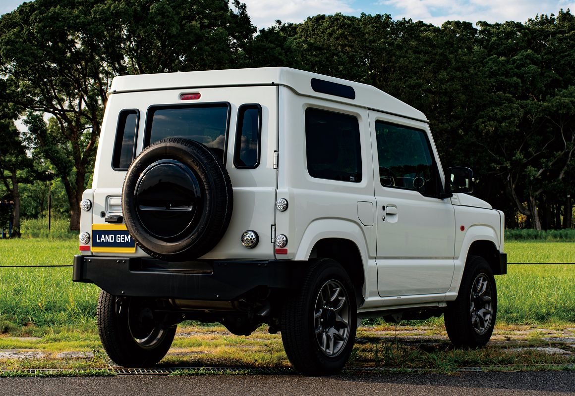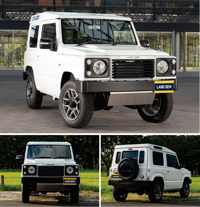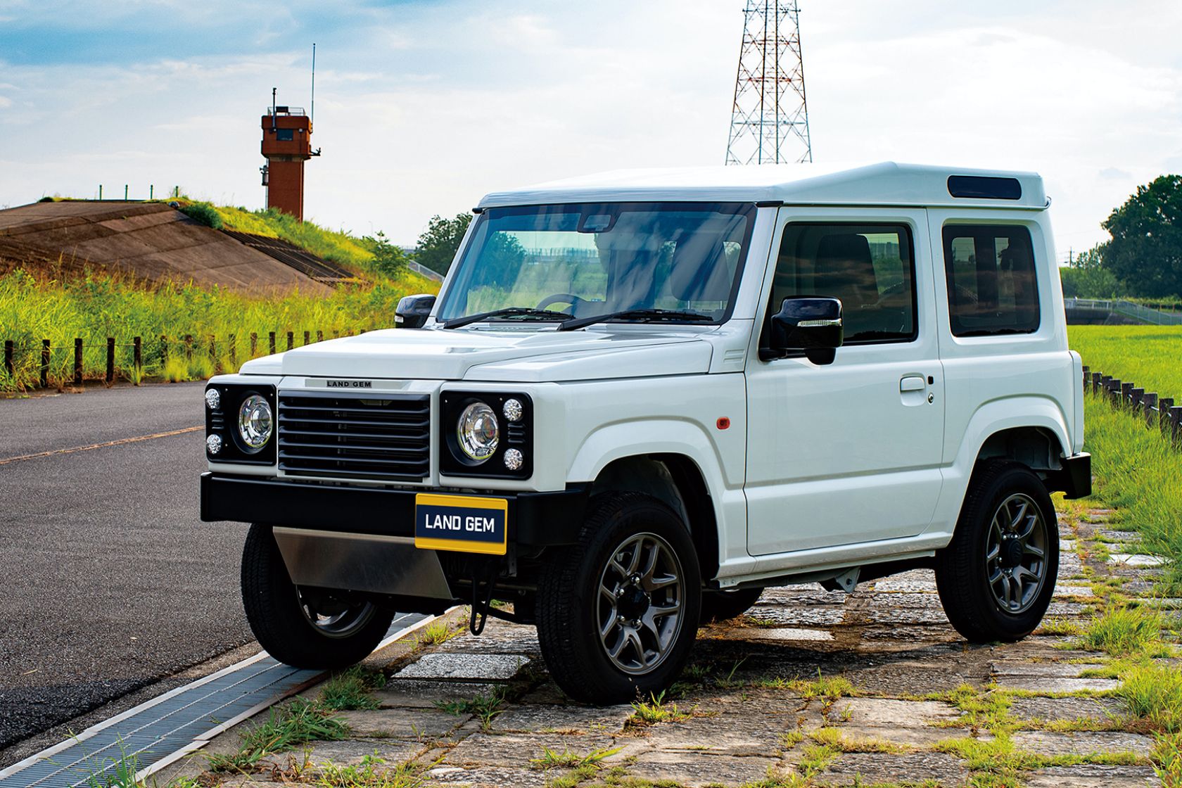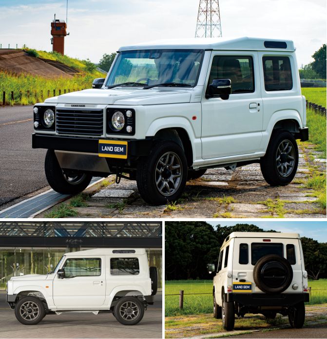 スズキ・ジムニー(JB64)用カスタムパッケージ「LAND GEM(ランドジェム)」。サン・カーズ独自開発のパーツ10種類を取り付けることで、ジムニーのスタイルが一変します。タフなルックスは、さながら名車ランドローバー・ディフェンダーのよう。オリジナリティあふれる特別なご提案です。